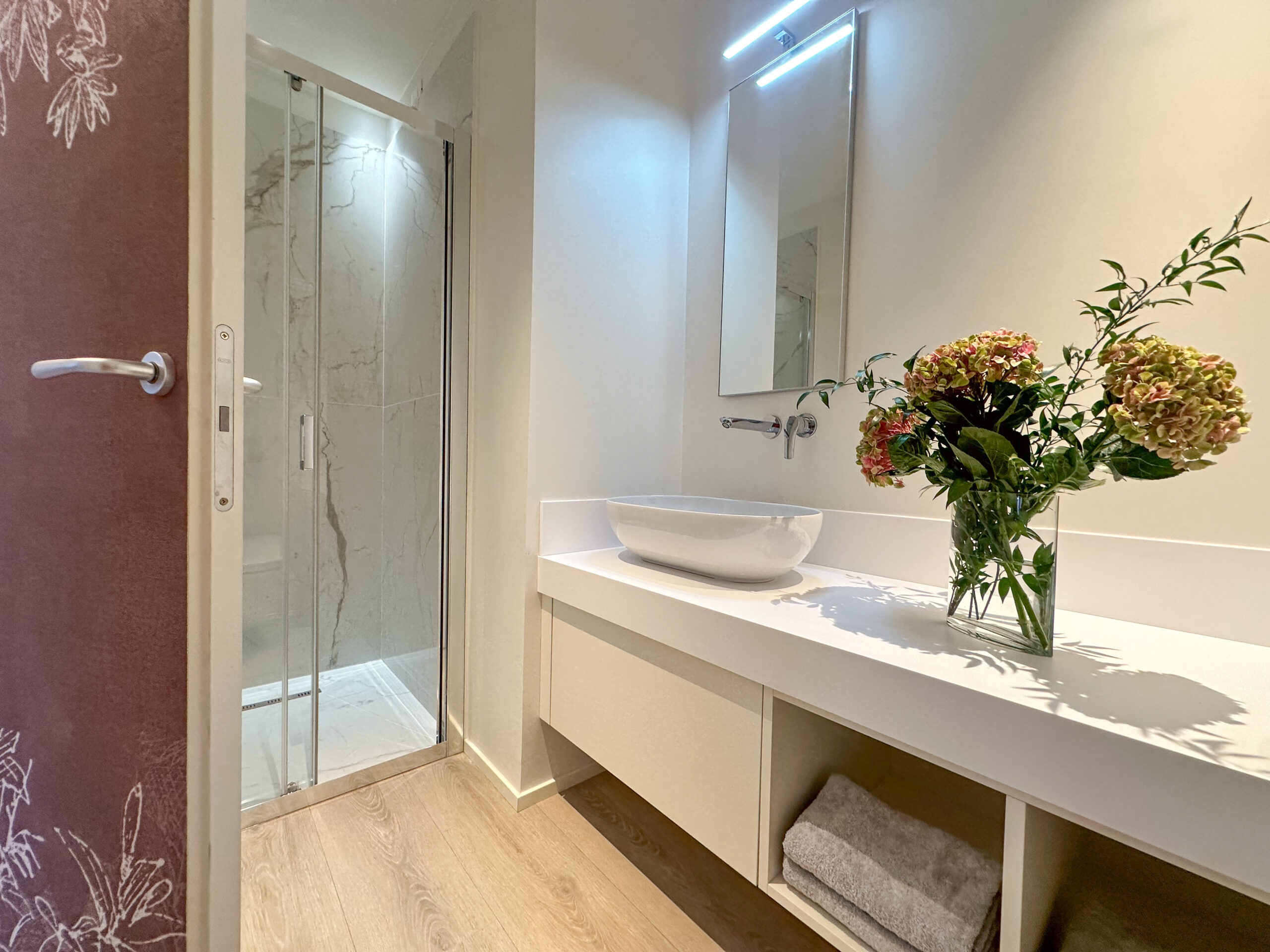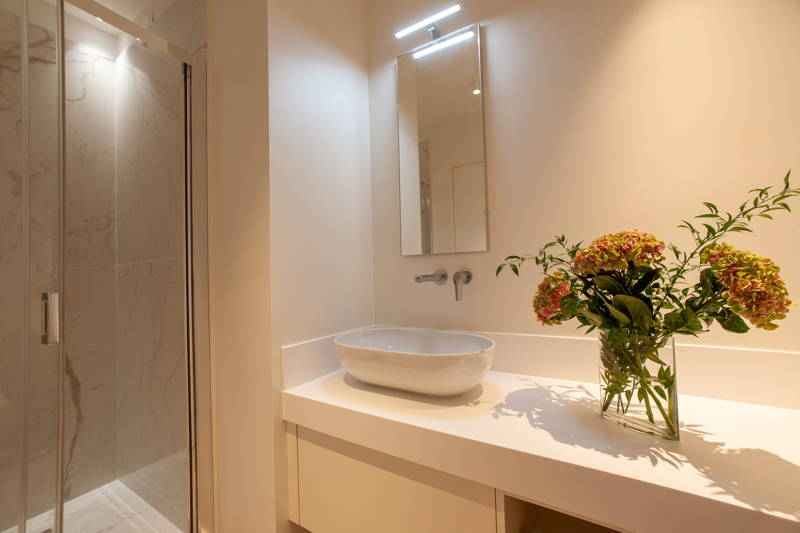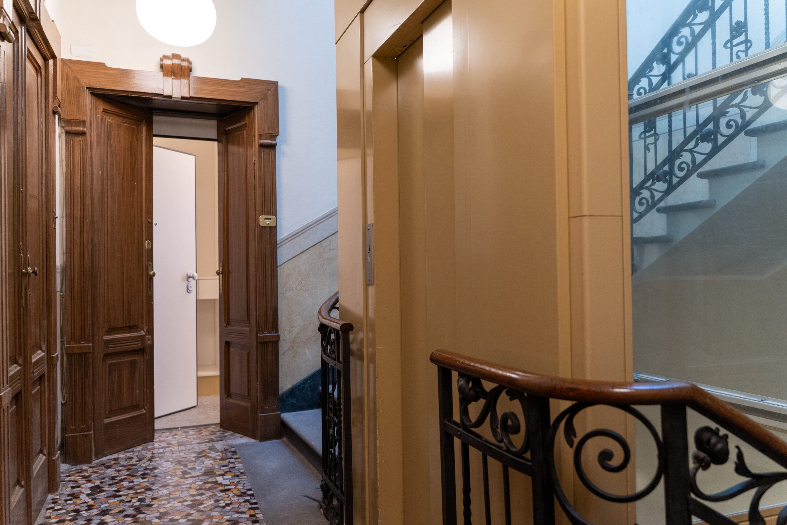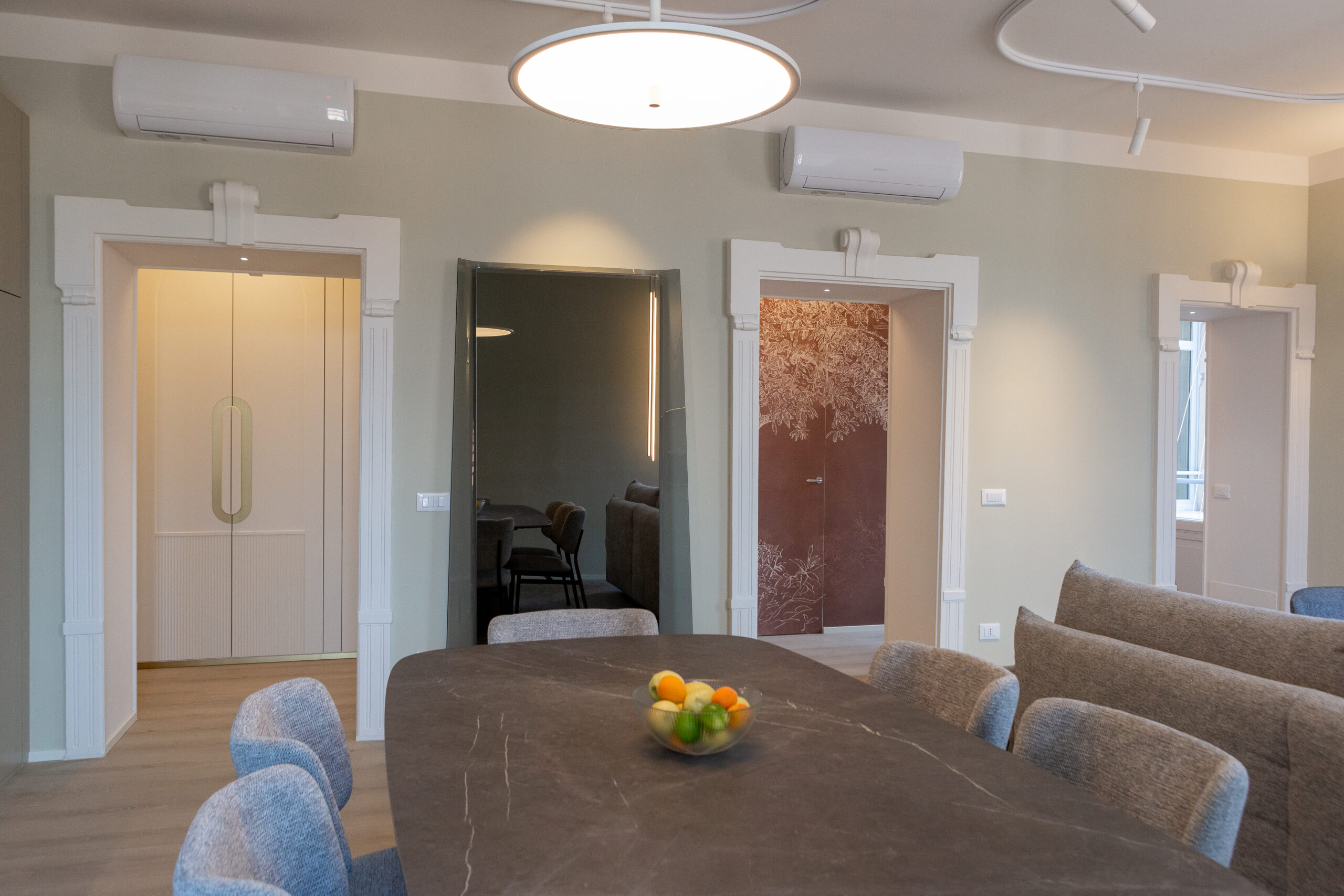 The apartment, serviced by an elevator, comes with two full bathrooms with large spacious rain showers, a modern fully equipped kitchen, an open space dining room and living room with Smart TV. All the comforts essential for a memorable stay.