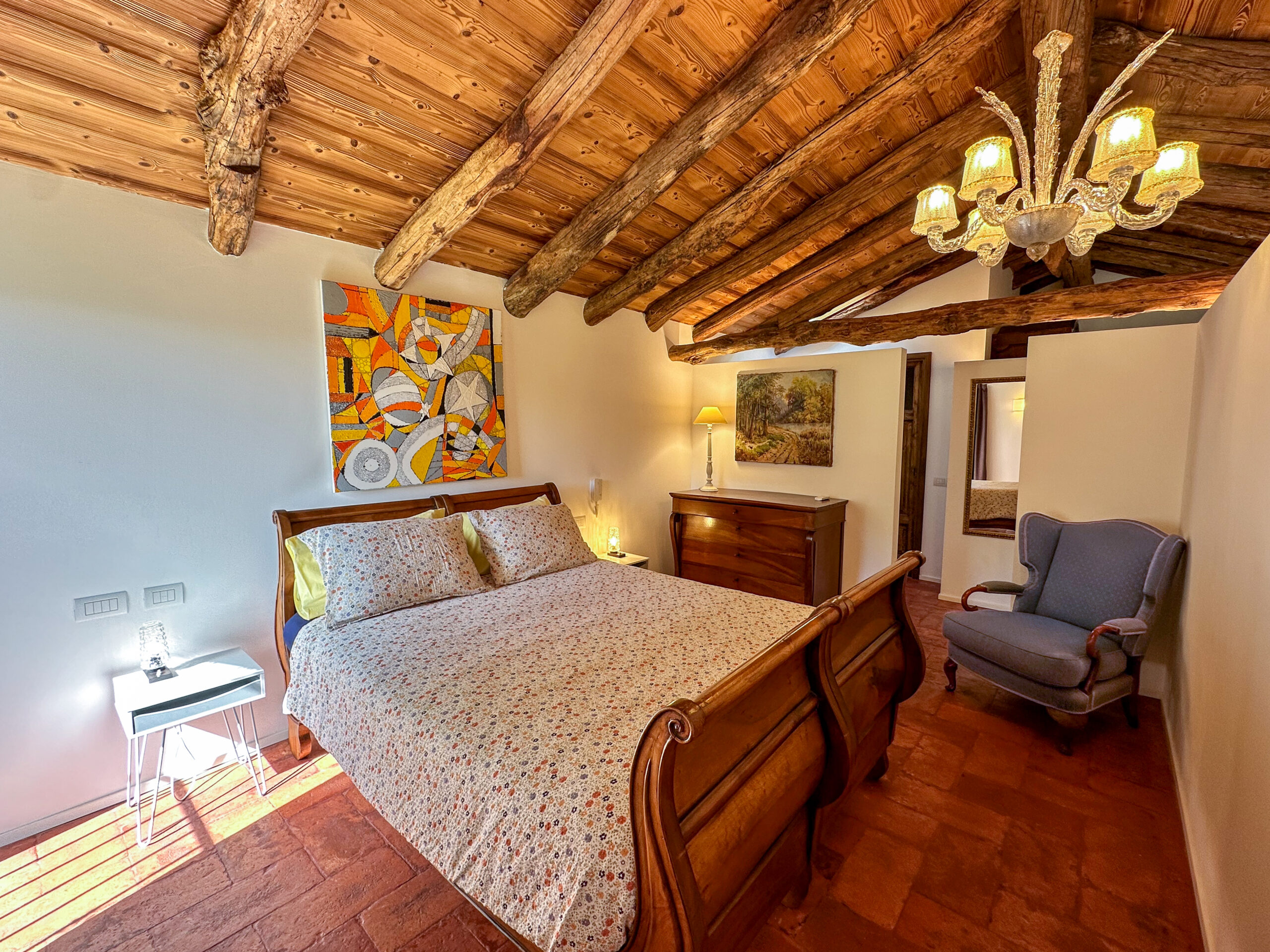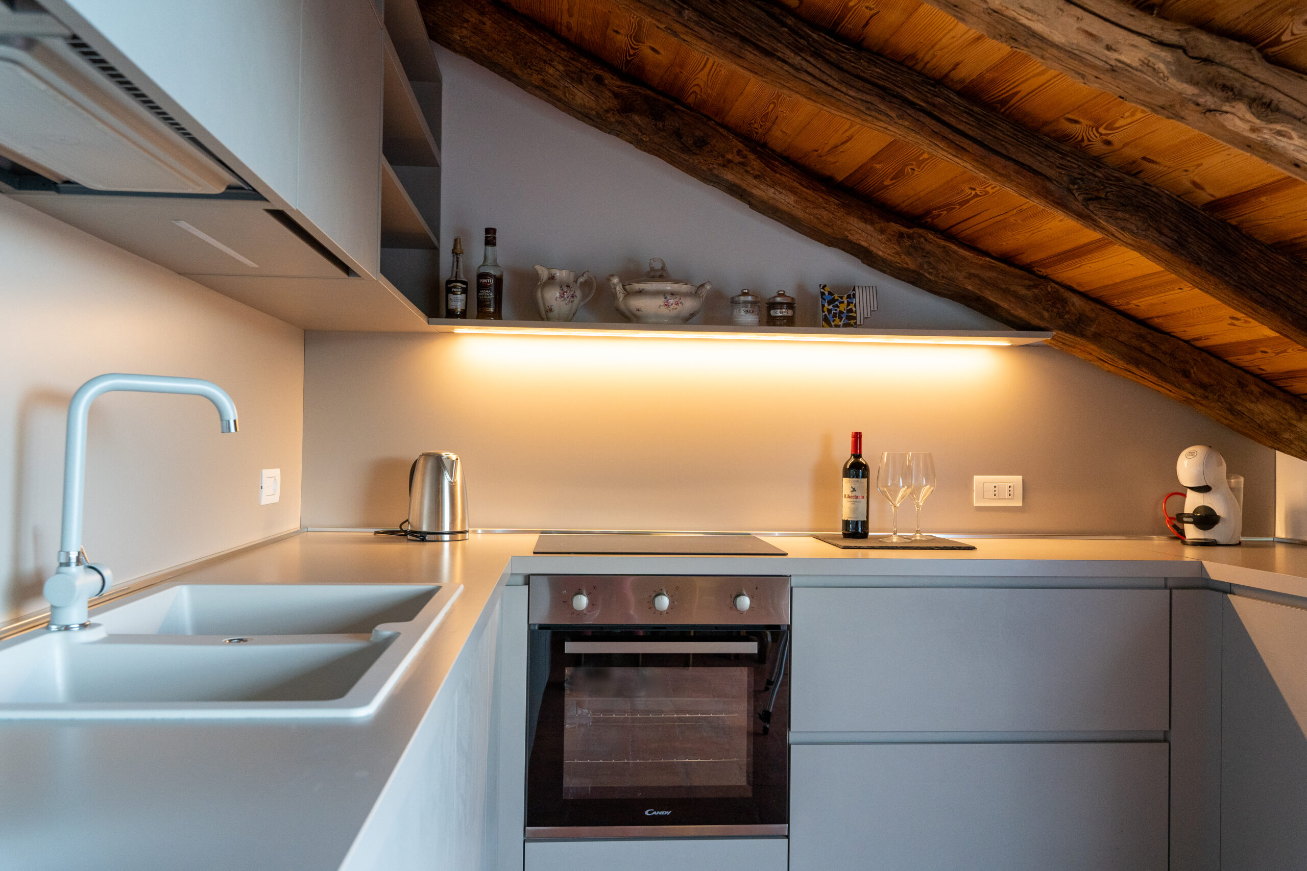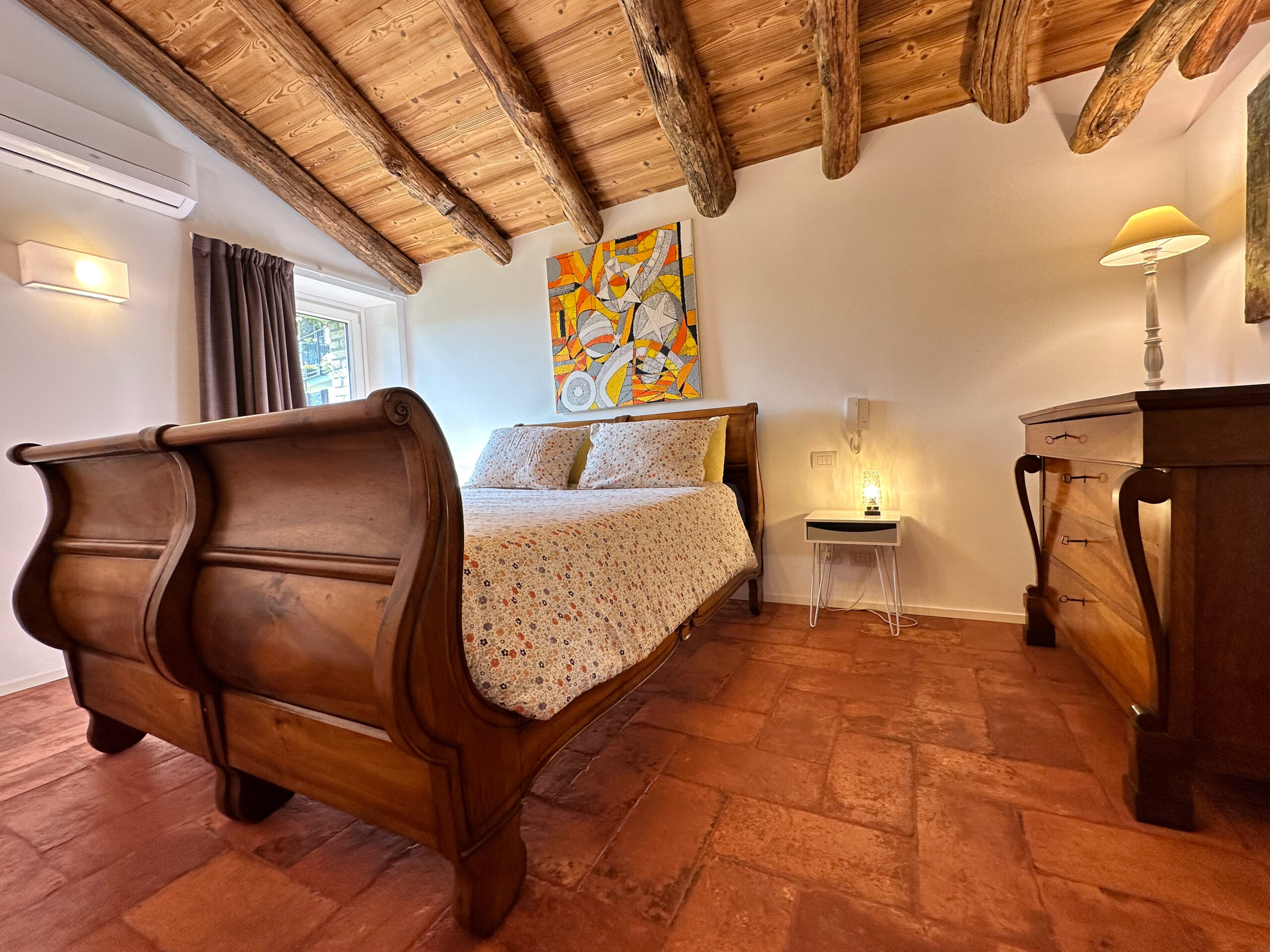 While the architect maintained the original features such as terra cotta floors, exposed wooden beams, the stone facades, he added all the modern comforts creating a living space of luxury. The apartment has a fully equipped kitchen, air conditioning, a home sound system, WI-FI, terrace with stunning lake views, one bedroom with a queen-sized bed, one small bedroom with 2 single beds (bunkbeds) and one full bathroom. There is outdoor parking on the premises.
