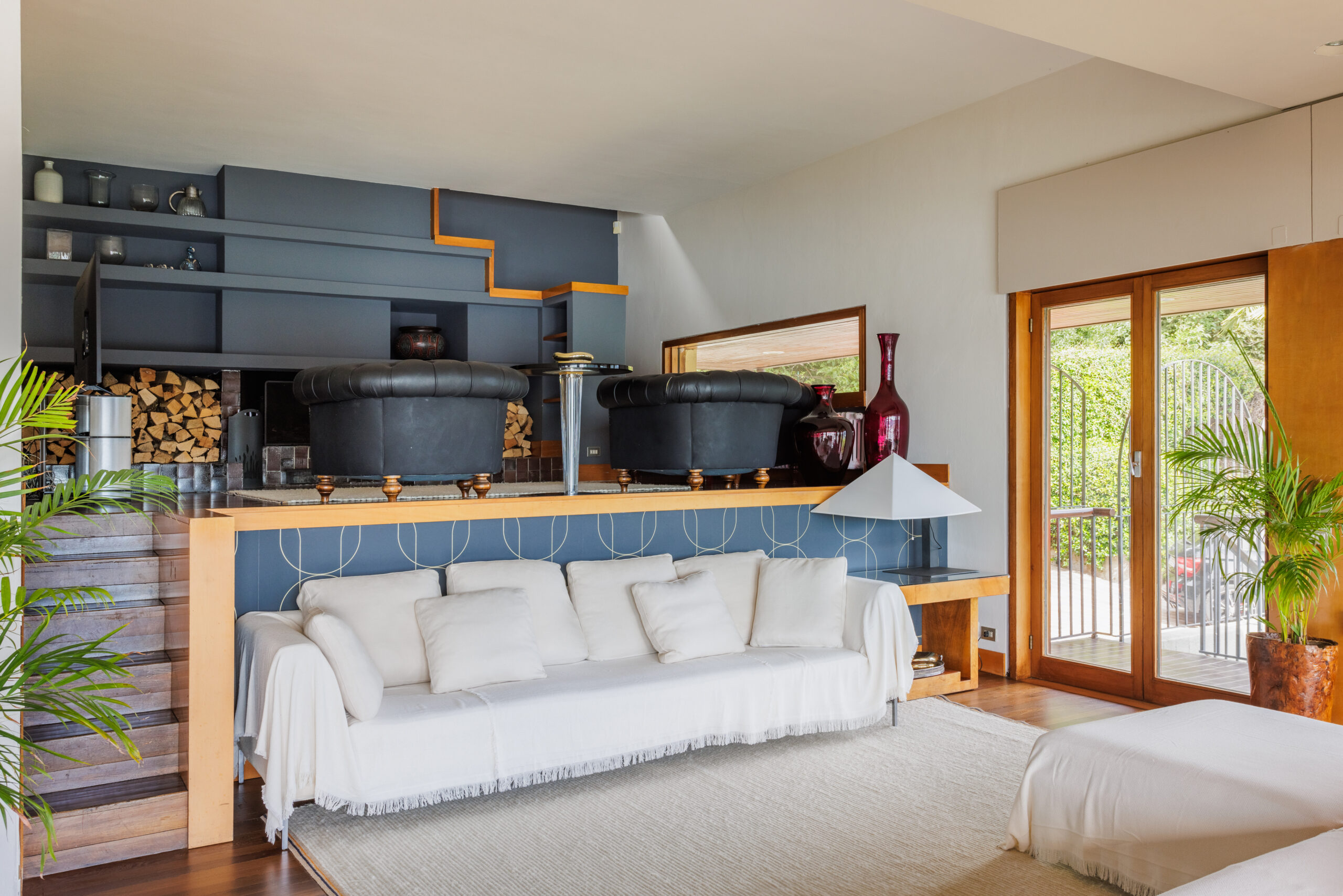 A welcoming room with comfortable sofas and shelves full of books, perfect for moments of relaxation and reading. Warm atmosphere, with a large window that illuminates the room and allows you to enjoy the view of the lake.